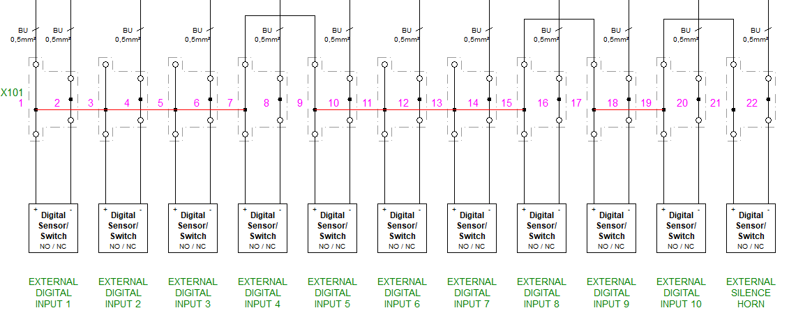 Für die Fernabschaltung der Hupe steht die Klemme 22 auf der Klemmleiste X101 optional zu Verfügung. Es stehen 10 einzelne digitale Eingänge zur Verfügung, die als Schließer oder Öffner konfiguriert werden können. Die Konfiguration und Verwendung der digitalen Eingänge werden in deren Gebrauchsanweisung beschrieben. Siehe auch: Digitale Eingänge