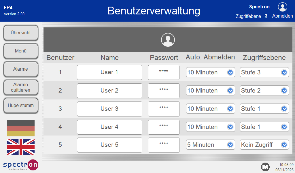 Drücken Sie „Benutzerverwaltung“, um Namen, Passwörter, Zugriffsebenen und Anmeldezeit zu verwalten.