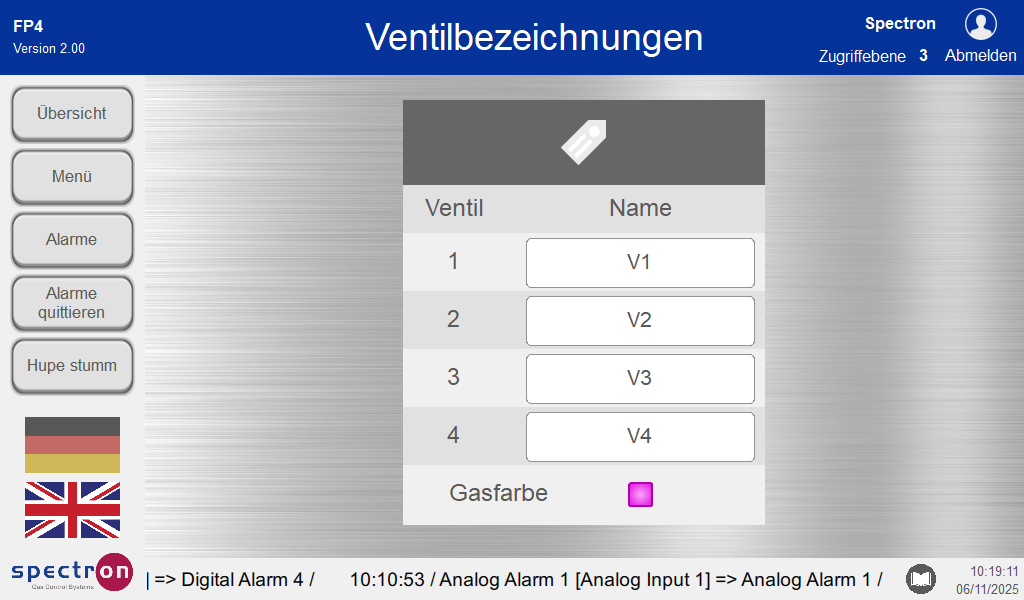 Drücken Sie im Konfigurationsmenü „Ventilbezeichnung“ um die Namen der Ventile in der Standardübersicht zu ändern. Über das farbige Kästchen kann die Farbe für das Prozessgas gewählt werden.