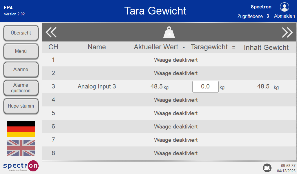 Wenn ein Taragewicht eingegeben wurde, wird das Gewicht des Flascheninhalts als Anzeigewert ausgegeben. Dieser Wert wird zum Auslösen von Alarmaktionen verwendet.