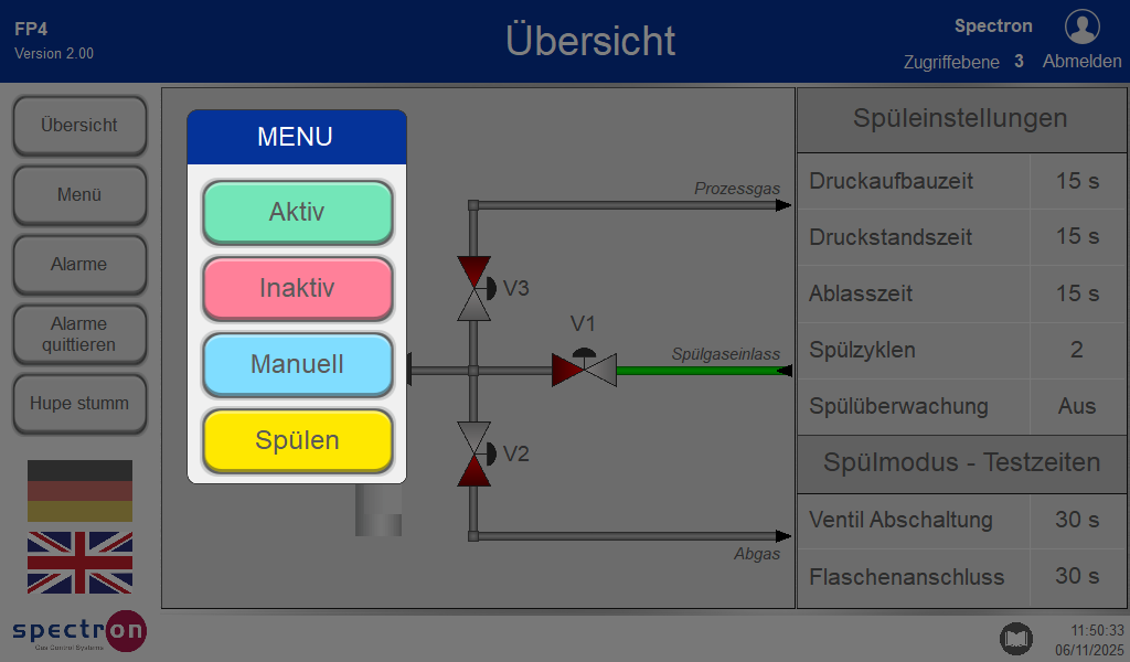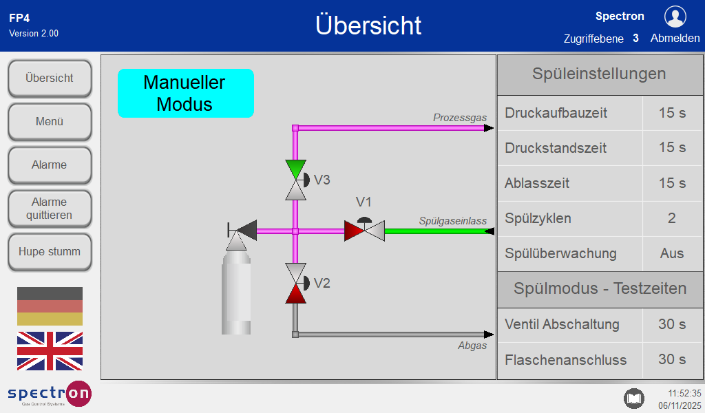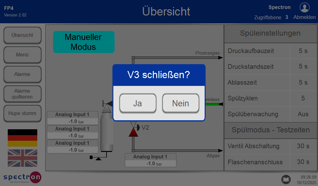 Dieser Modus wird nach 15 Minuten beendet oder dann, wenn sich der Benutzer abmeldet. Dabei werden alle Ventile, die sich im manuellen Modus befunden haben, automatisch geschlossen.