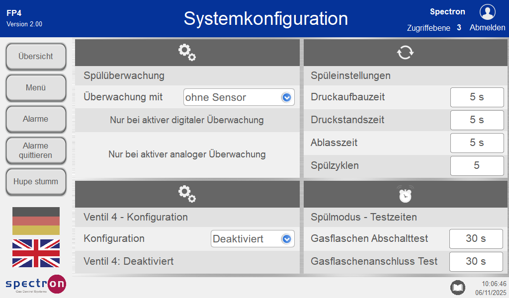 - Dauer der Prozessgasquellen-Abschaltzeit (Dichtheitstest des Flaschenventils)
