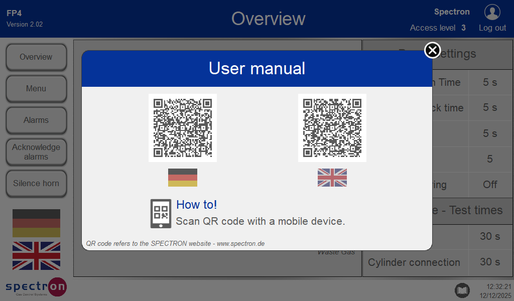 Pressing the icon (small book at the bottom right) takes you to the selection menu (QR codes) for the operating instructions that are available.