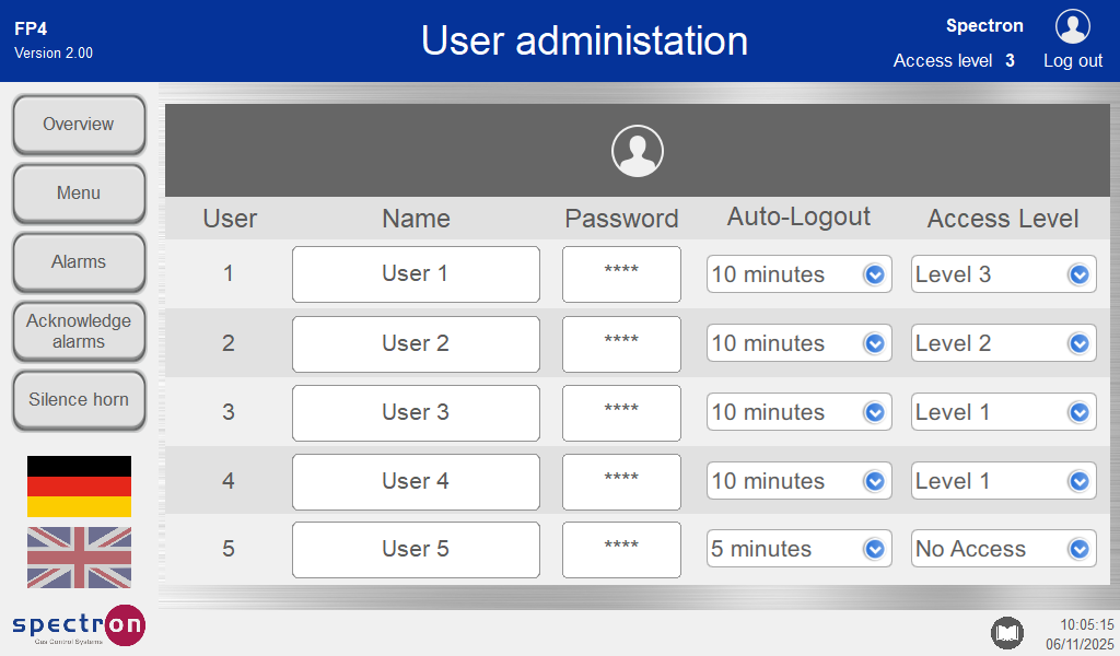 Pressing the name or password displays a keyboard for data entry. A maximum of 16 characters for the long name can be entered for each user. PIN numbers from 0001 to 9999 can be entered as passwords.