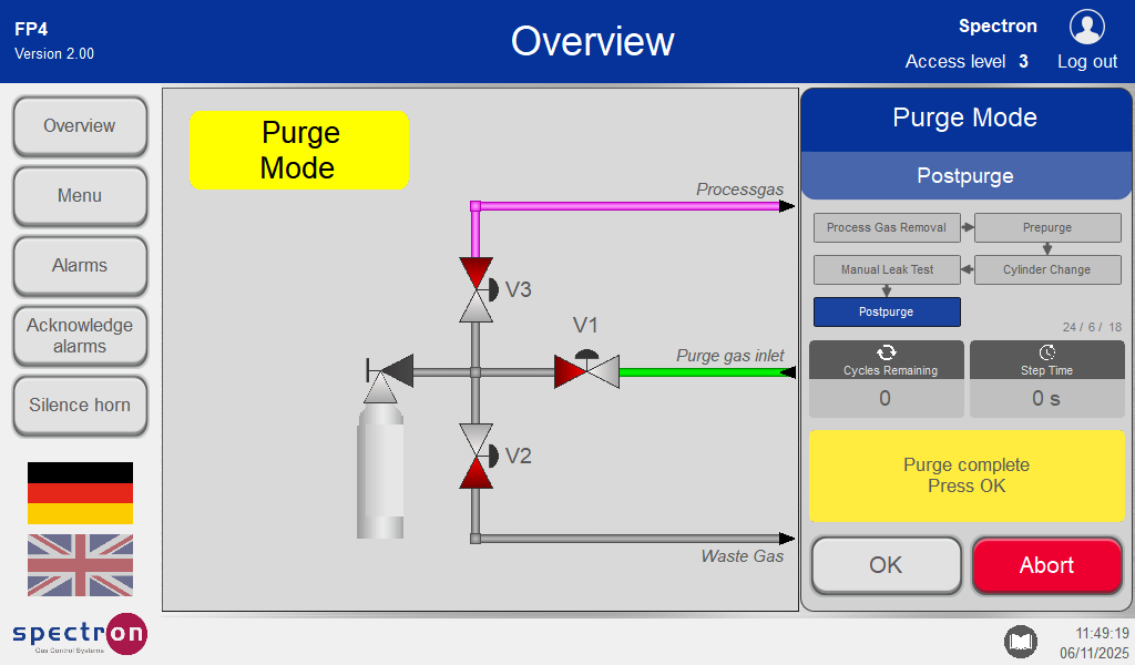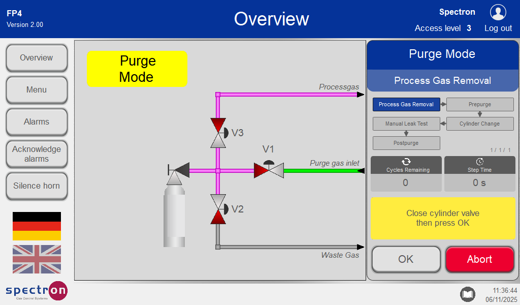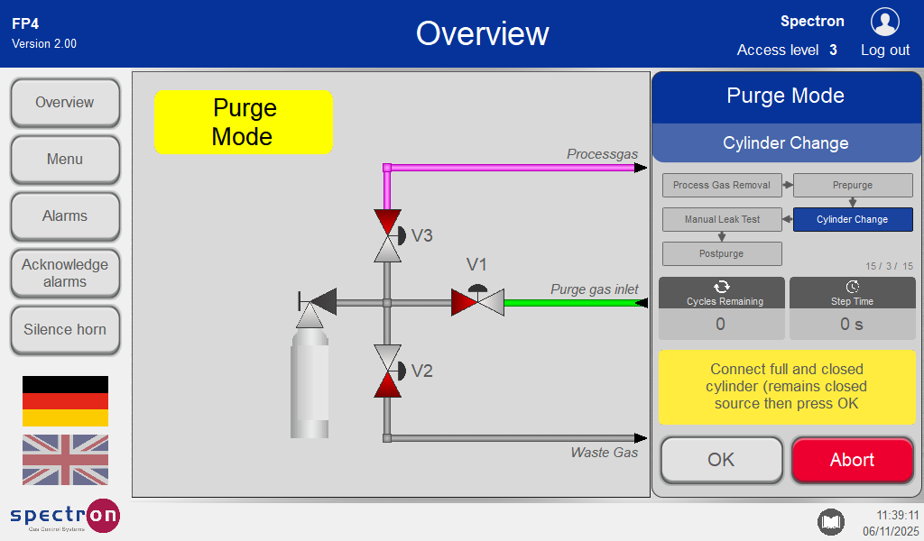 After the purge run-throughs, it must be confirmed whether you are ready for the cylinder change. In the event of an unconfigured purge monitoring system, the purge sequence is to be monitored manually. In the event of malfunctions in the purge sequence, the process must not be continued.