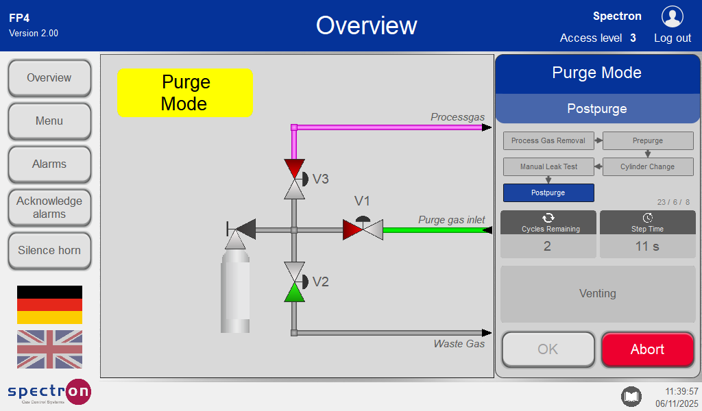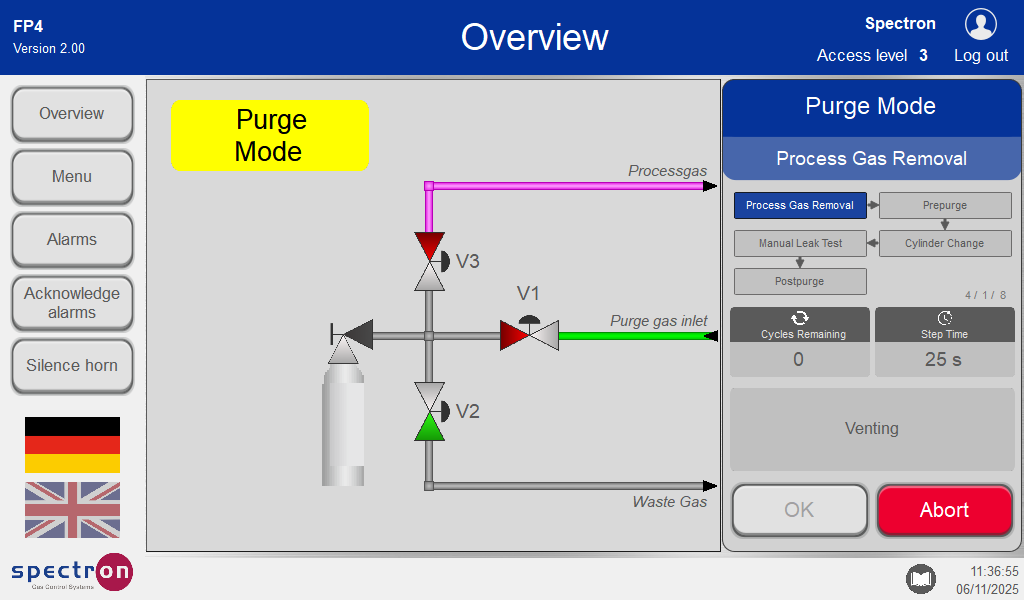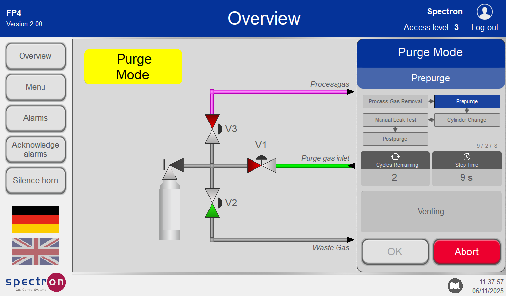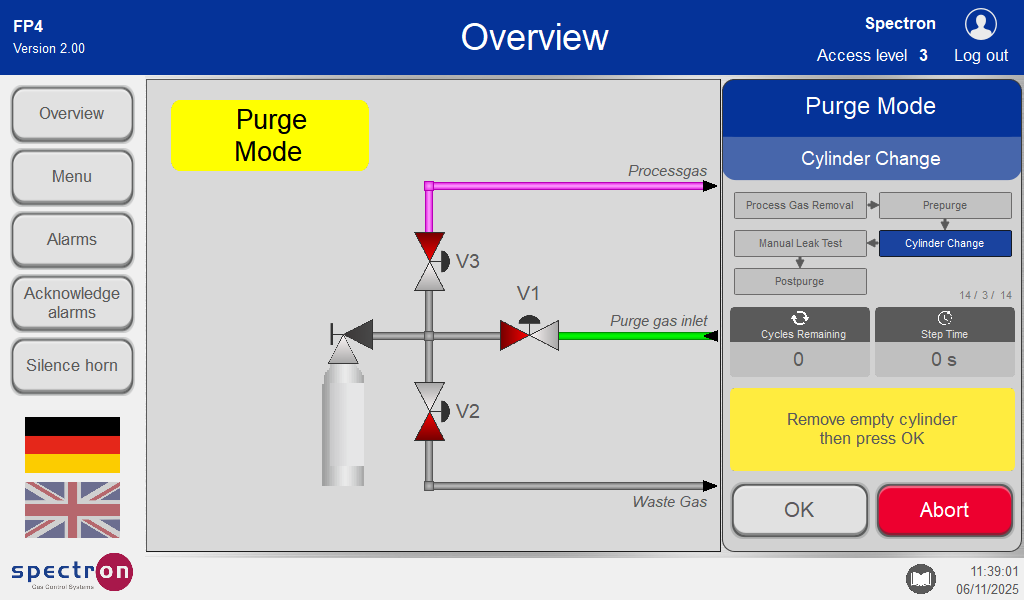 On confirmation, the pre-purge program is run before the cylinder change, which completely flushes out the remaining process gas in the lines before removing all traces of the process gas source.
