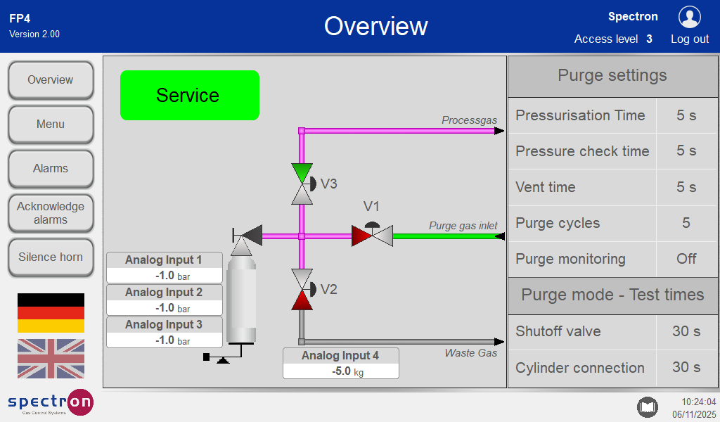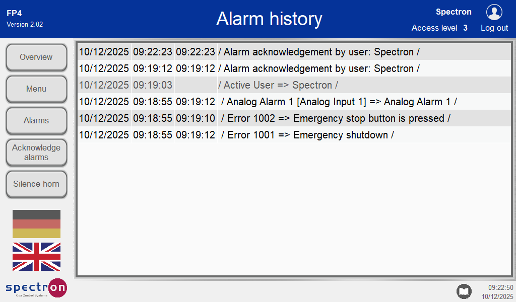 When an alarm is triggered, the date and time as well as the name of the alarm are recorded. The entries of the resolved alarms must be cancelled to be able to resume operation. They can only be cancelled if access is enabled with a level 1 or 2 password.