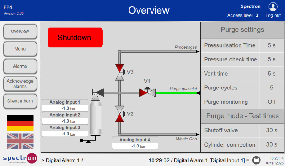On the following screen, analogue input 1 has triggered an alarm because the set cylinder pressure has not reached the setpoint value.